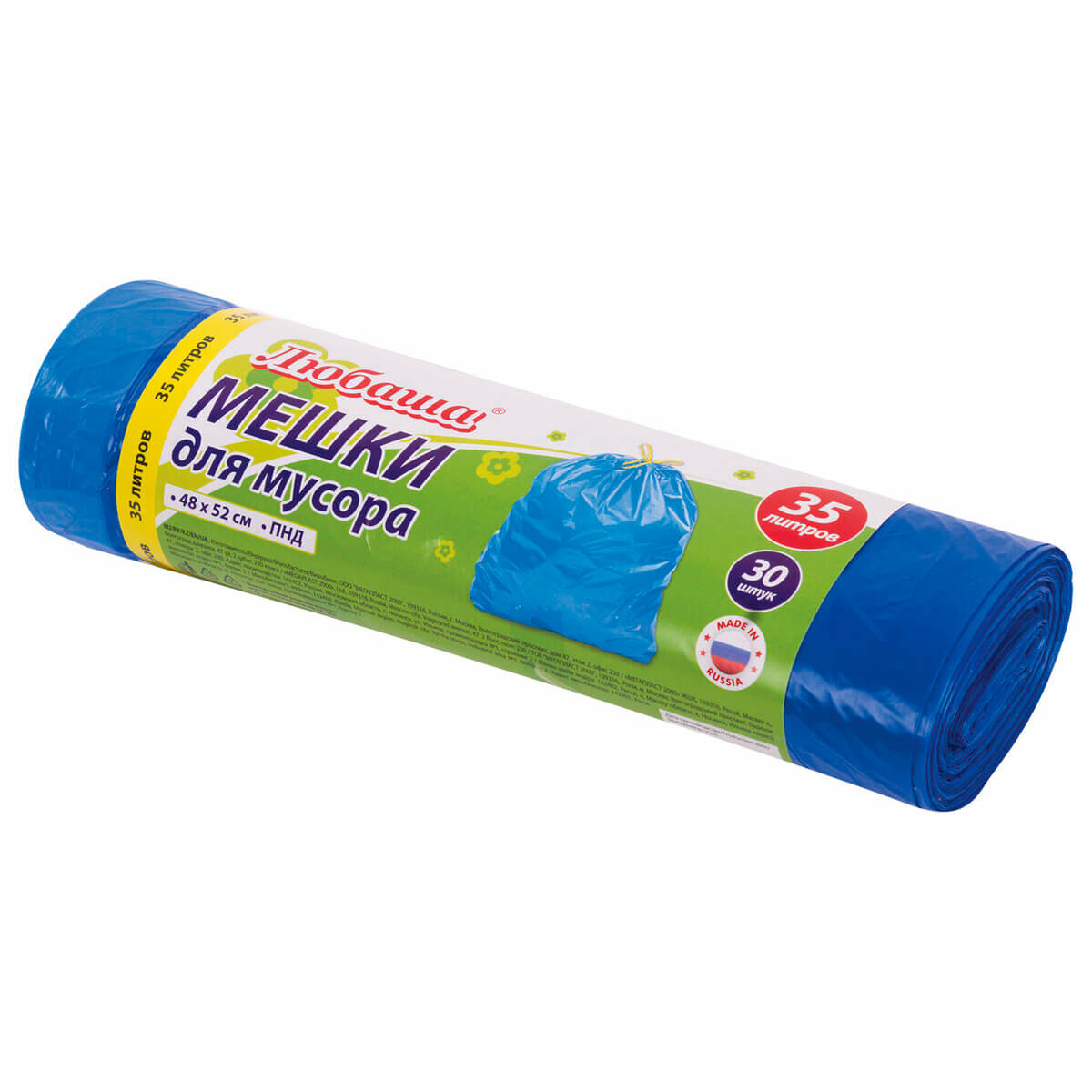 Мешки для мусора 35 л, с завязками, синие, в рулоне 30 шт., ПНД, 13 мкм, 520х480 мм, Любаша, 608095