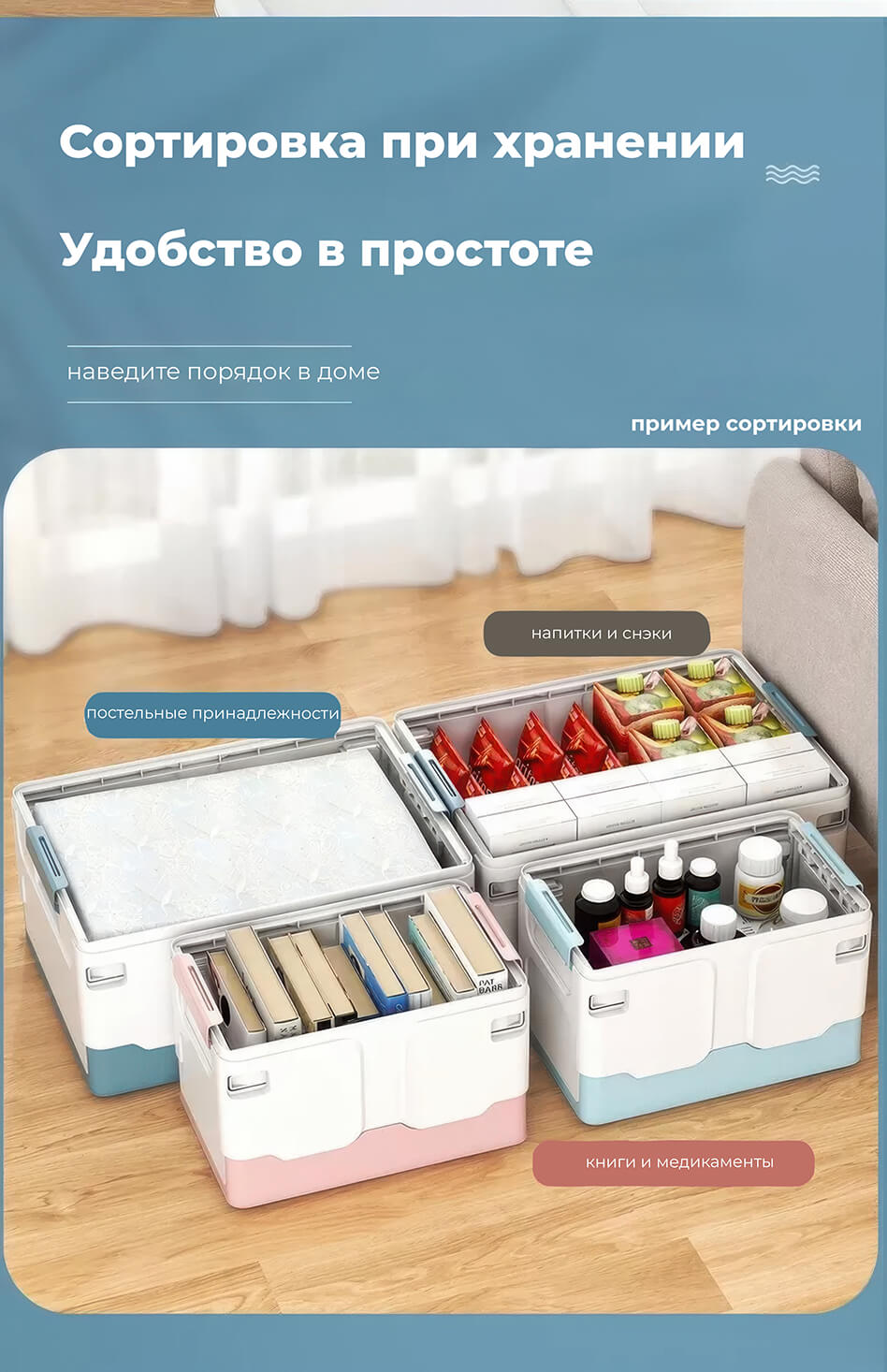Складной ящик 480х360х240 мм, бело-голубой – стильное и практичное решение для хранения